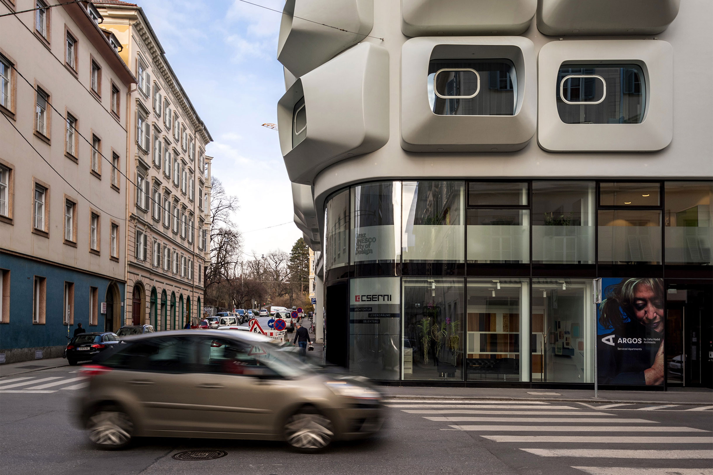Mit diesem neuen, im Februar 2020 eröffneten ARGOS Serviced-Apartments Designkonzept erhält Graz nun eine hochwertige Baukunst sowie modernes Denkmal zu Ehren der verstorbenen Ausnahmearchitektin Zaha Hadid. Ein Denkmal auf einem Grundstück mit wechselvoller Historie: 1590 erstmals als Teil der Hofstallungen Erzherzog Karls II erwähnt, wurde hier 1785 das „Kommodhaus“ errichtet, das ebenso Künstlerensembles und -organisationen wie eine Reihe von Gastronomiebetrieben beherbergte. Der vom Grazer Stadtsenat 2003 mehrheitlich beschlossene Abbruch des einsturzgefährdeten Hauses bildete schließlich den Auftakt für dieses neue Designprojekt.