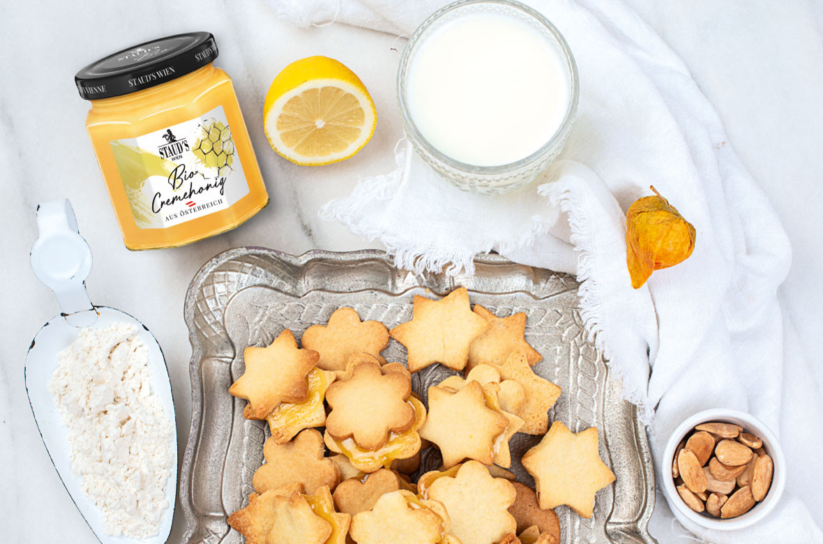 Weihnachten ohne selbstgebackene Kekse? Unvorstellbar! Wir teilen ein einfaches, aber raffiniertes Rezept für zarte Mürbteigkekse, die mit STAUD'S Bio Cremehonig gefüllt werden – ein unwiderstehlicher Genuss, der nicht nur die Herzen von Honigliebhabern höherschlagen lässt.